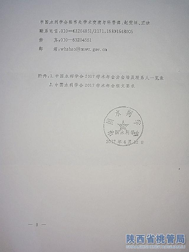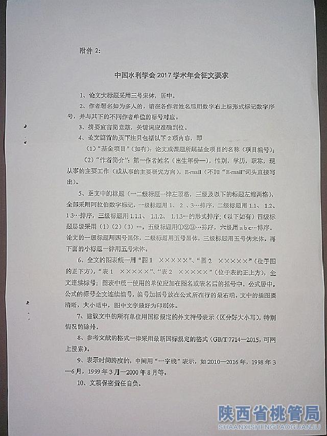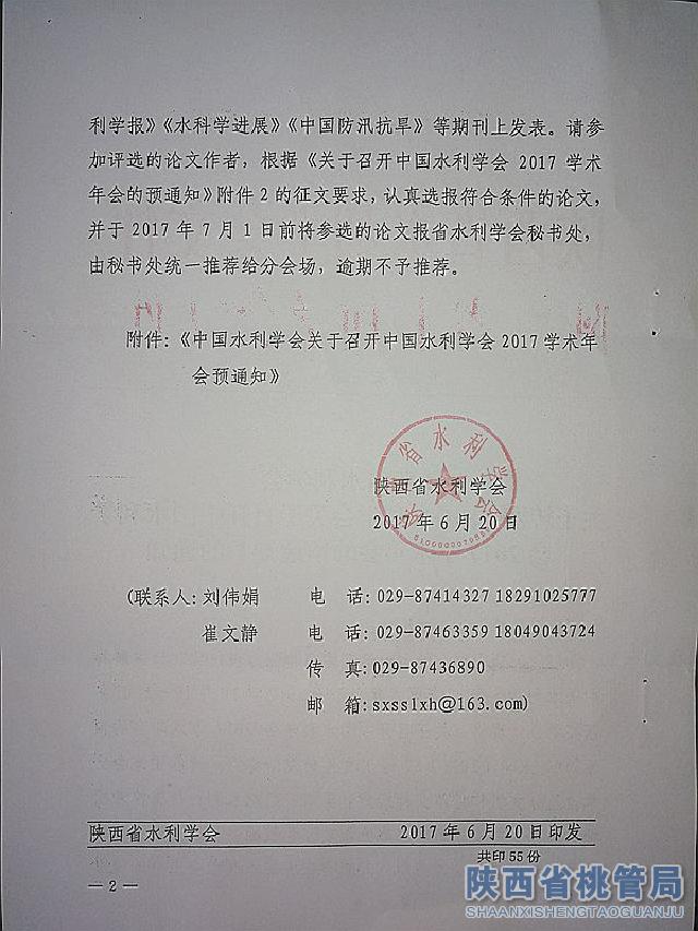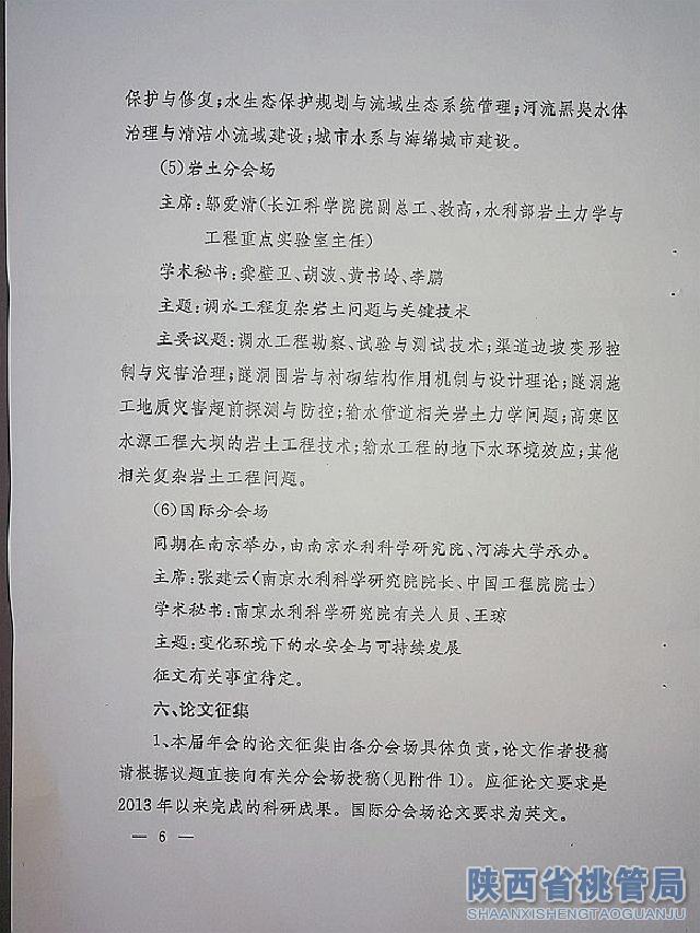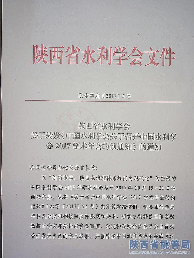 根据陕西省水利学会关于转发《中国水利学会关于中国水利学会2017学术年会的预通知的通知》陕水学会【2017】58号文件要求,请全局技术干部将2013年以来完后的科研成果积极投稿,欢迎和鼓励在年会上公开发表自己的学术成果,并推荐在中国水利学会主办的期刊上发表。请按文件要求和时限积极参加。